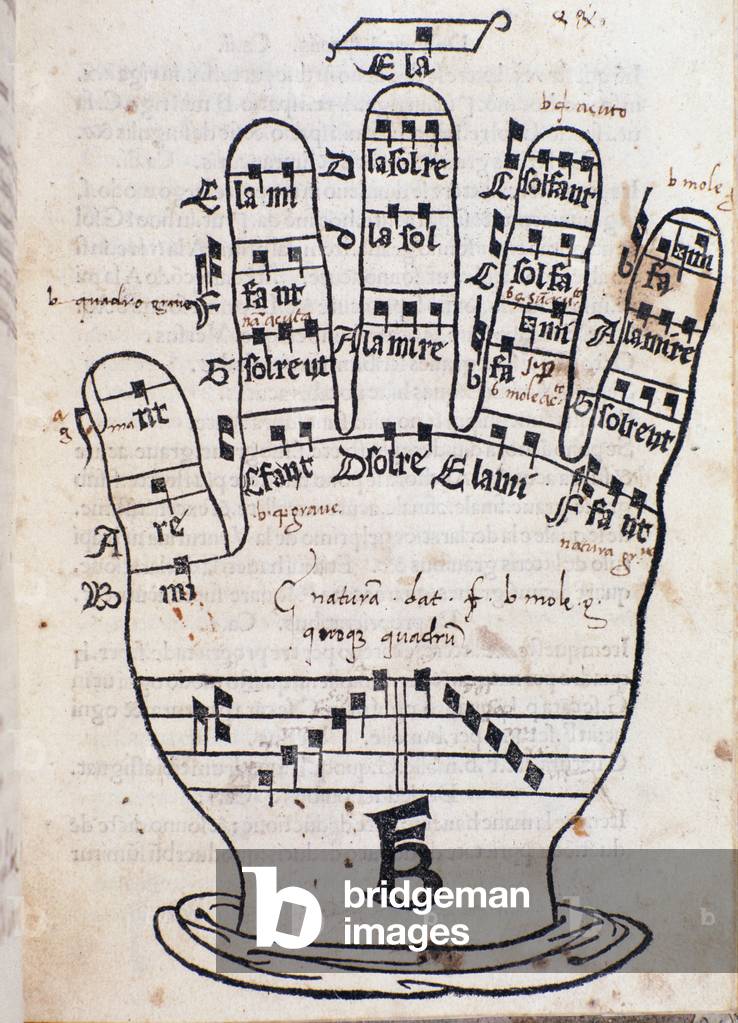 "The Guido d'Arezzo hand" Page from "Regula musica" by Bonaventura da Brescia (c. 1452-c. 1517), Italian School, (16th century) / Bridgeman Images