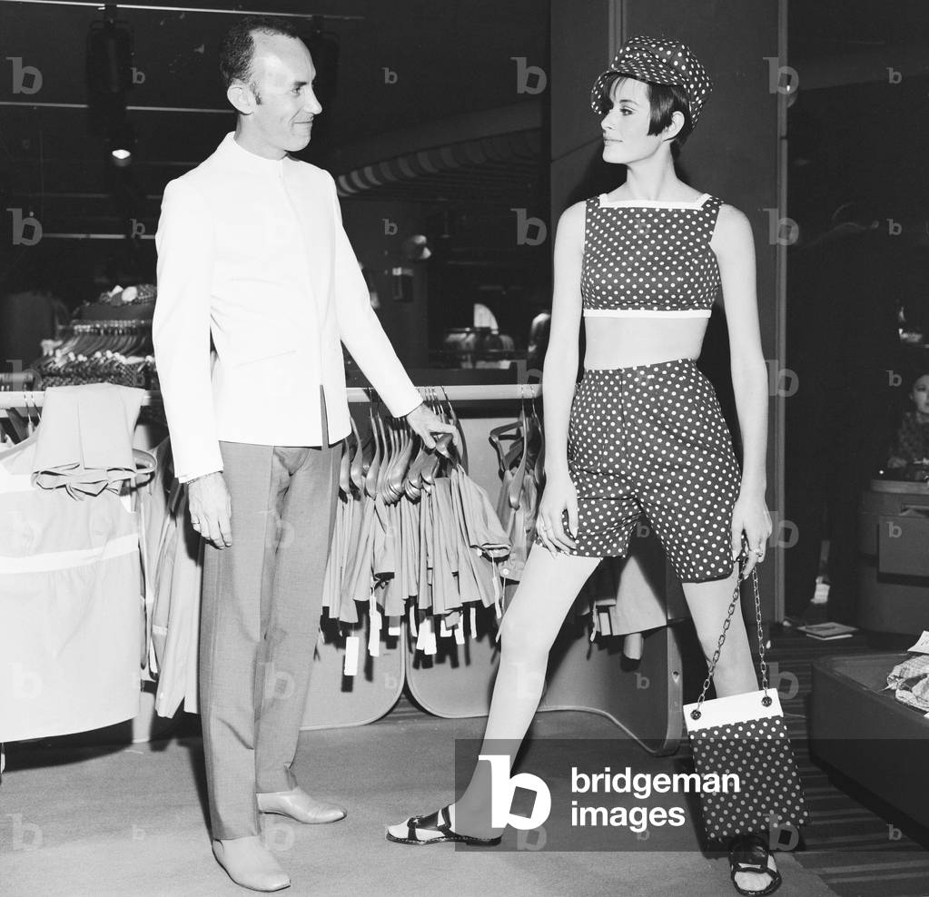 MPX5160816: "Way In" the new unique 20,000 square foot boutique planned by Sir Hugh Fraser for the fourth floor of Harrods set to open on the 7th June 1967. Designer Ruben Torres who is putting on a show of his clothes is seen here with model Shoula Tevet wearing an outfit called "Chocolate Chip". 5th June 1967 (b/w photo) / Bridgeman Images