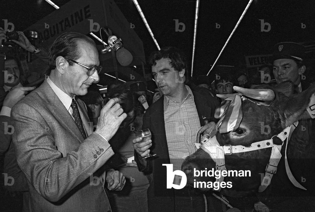 "Salon de l'Agriculture" (agriculture show) in Paris, March 11, 1980 : the mayor of Paris Jacques Chirac drinking wine with a farmer and his cow (b/w photo) / Bridgeman Images