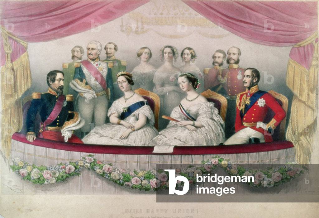 "Hail Happy Union", the State visit to the Royal Italian Opera by Queen Victoria, Prince Albert and the Emperor and the Empress of France, 1855 (coloured engraving), Alophe, Marie Alexandre (1812-83) (after) / Bridgeman Images