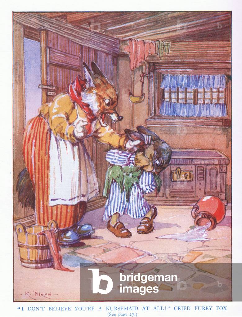 "I don't believe youre a nursemaid at all!" cried Furry Fox, illustration from 'The Adventures of Binkle and Flip ', 1950's (colour litho), Nixon, Kathleen Irene (1895-1988) / Bridgeman Images