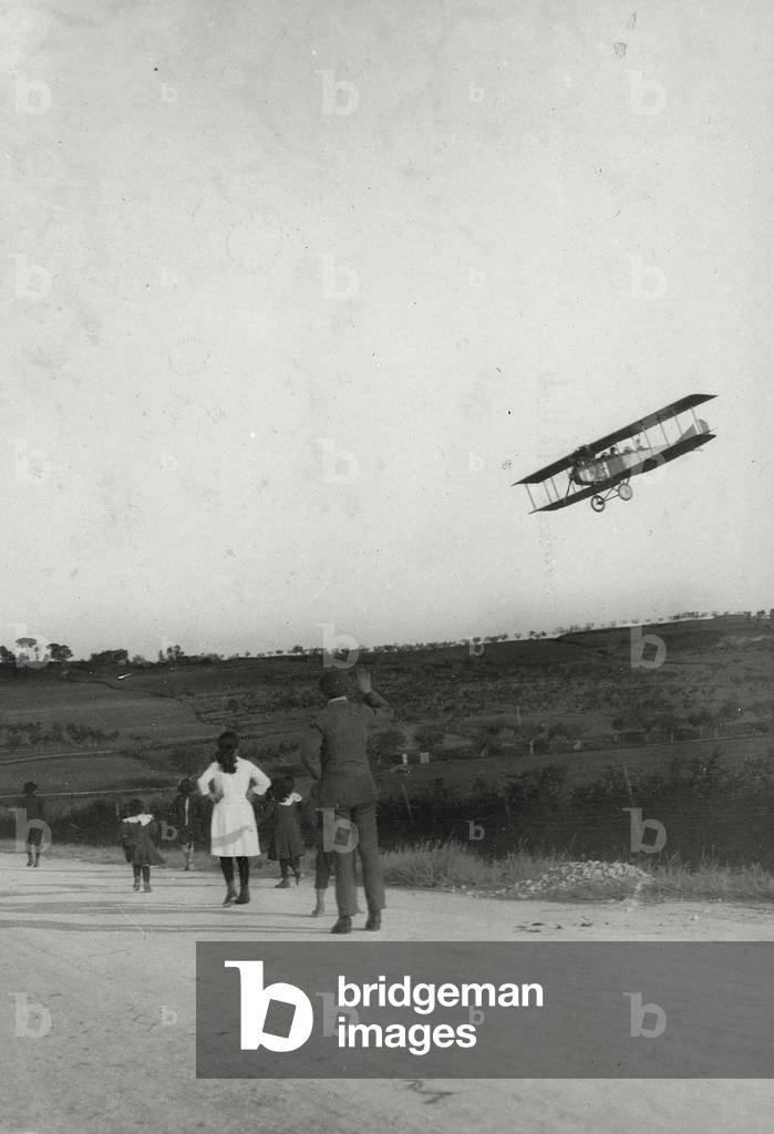 "L'aereoplano atterra", group of person that observe the an airplane's landing / Bridgeman Images