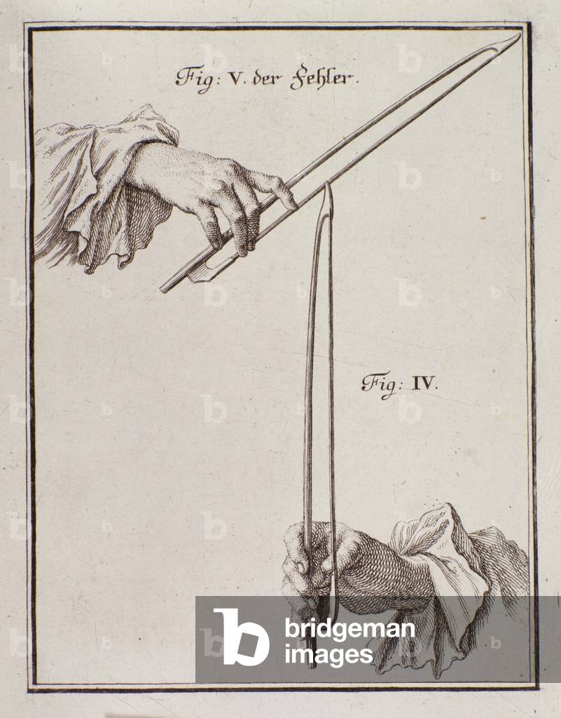 "How to hold archer" Page of violin method by Leopold Mozart (1719-1787) father of Wolfgang Amadeus, Italian School, (18th century) / Bridgeman Images