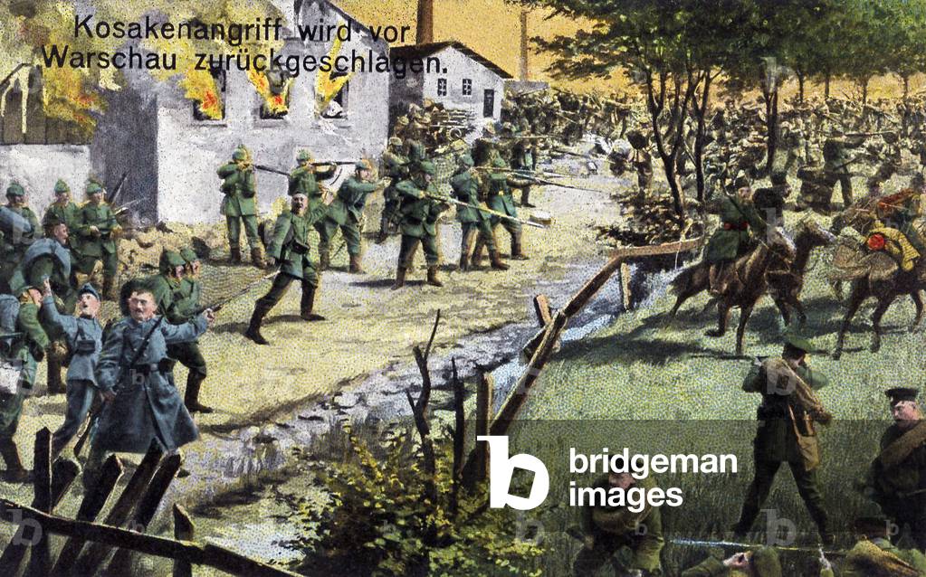 "The Attack of the Cossacks is Repulsed near Warsaw", 1915 (colour litho), German School, (20th century) / Bridgeman Images