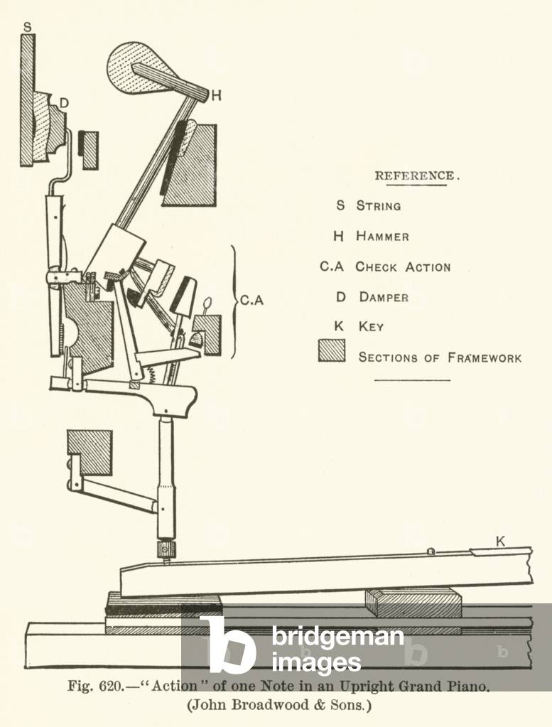 "Action" of one Note in an Upright Grand Piano, John Broadwood and Sons (engraving), English School, (20th century) / Bridgeman Images