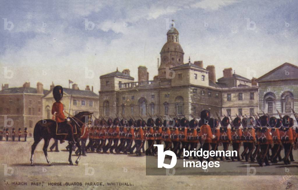 "A March Past", Horse Guards Parade, Whitehall (colour litho), English School, (20th century) / Bridgeman Images