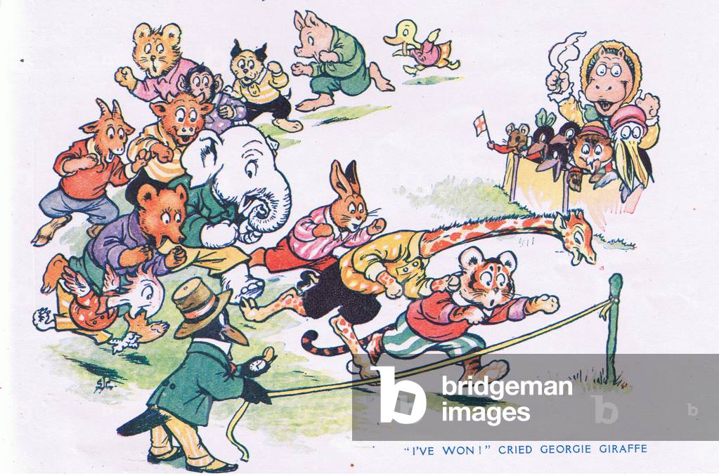 "I've won!" cried Georgie Giraffe , illustration from My Magazine (Arthur Mee), c.1920-30 (colour litho) / Bridgeman Images