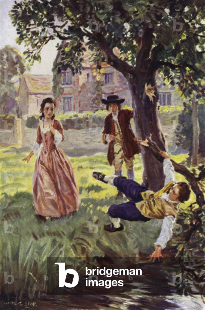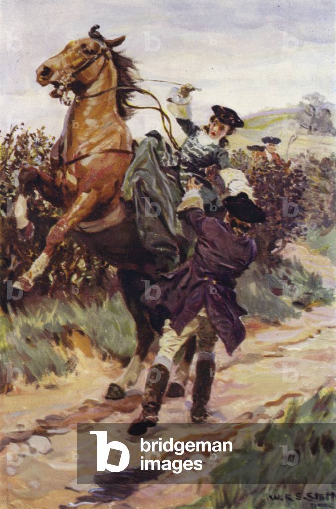 "The unruly beast threw his lovely burden from his back, and Jones caught her in his arms" (colour litho), Stott, W.R.S. (1878-1939) (after) / Bridgeman Images