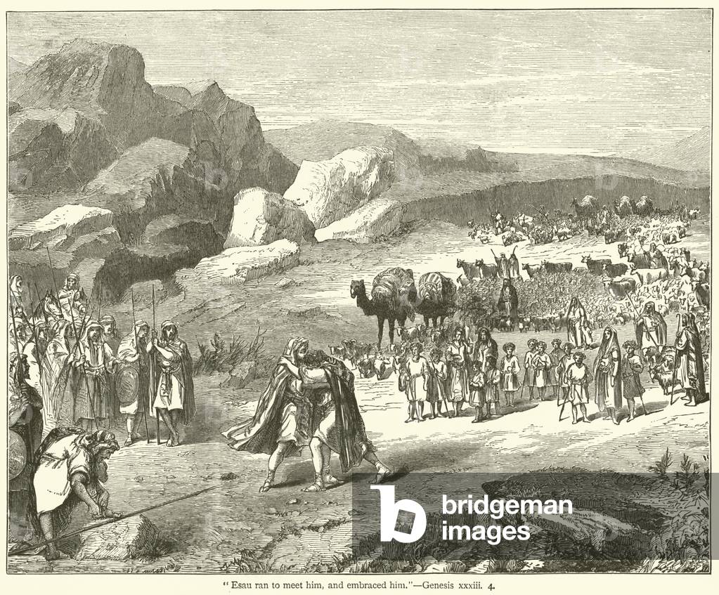 "Esau ran to meet him, and embraced him", Genesis, xxxiii, 4 (engraving), English School, (19th century) / Bridgeman Images