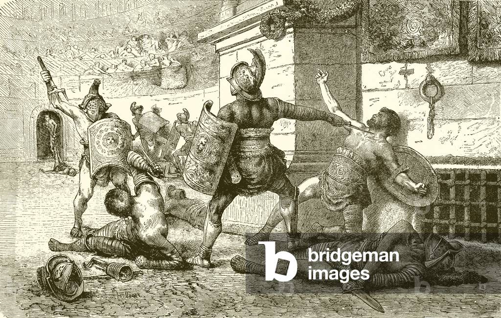 "A Roman Holiday." Combat of Gladiators. The Vanquished appealing to the Spectators (engraving), English School, (19th century) / Bridgeman Images