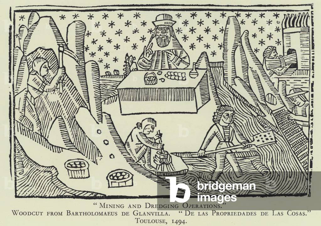 "Mining and Dredging Operations," Woodcut from Bartholomaeus de Glanvilla, "De las Propriedades de Las Cosas," Toulouse, 1494 (litho), English School, (20th century) / Bridgeman Images