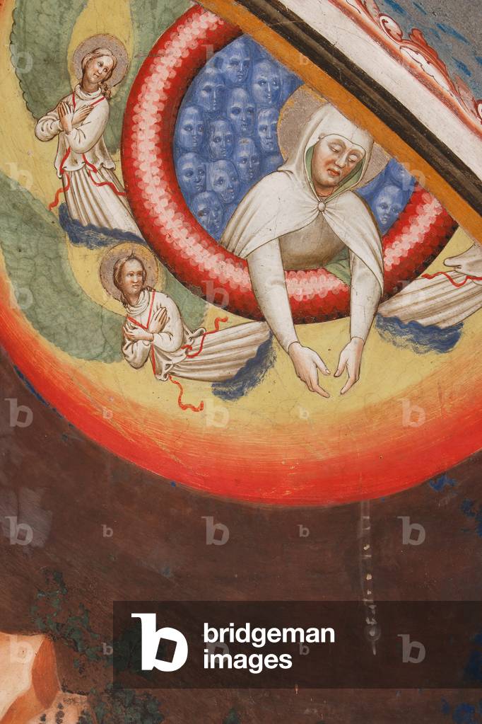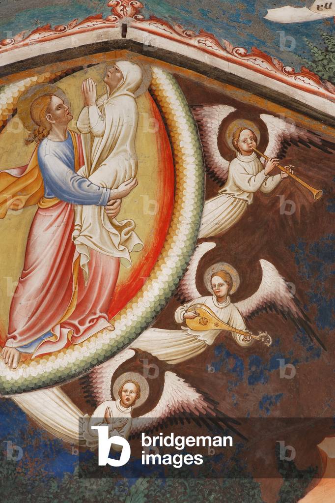 "Assumption of the Virgin" and "the Virgin Mary dropping the girdle or Holy Belt to St. Thomas ", Detail of Christ carrying the Virgin Mary to the sky and angels playing music, c.1420 (fresco), Master of Vignola (15th century) / Bridgeman Images