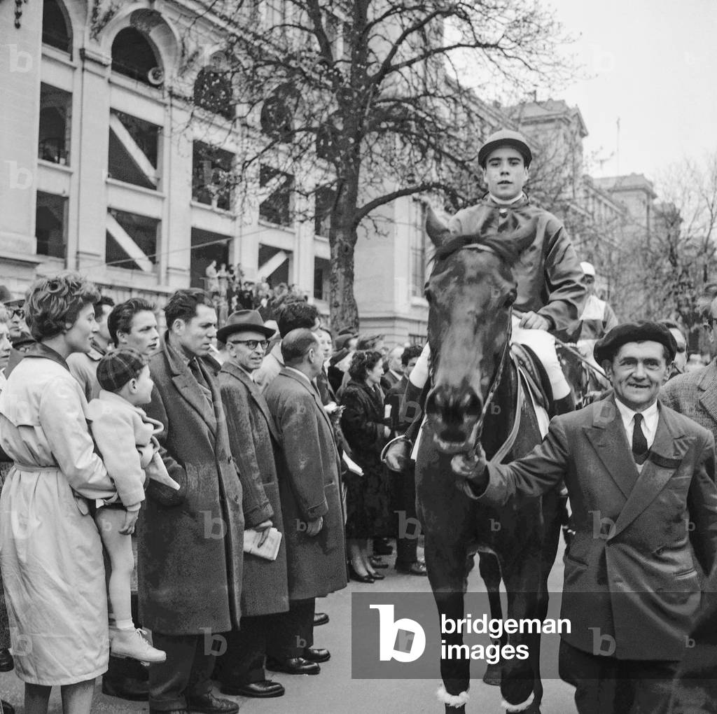 "Prix du President de la Republique" (horse race), in Auteuil racecourse, Paris, March 29, 1959 : the horse Voveen and the jockey Mathelin (b/w photo) / Bridgeman Images